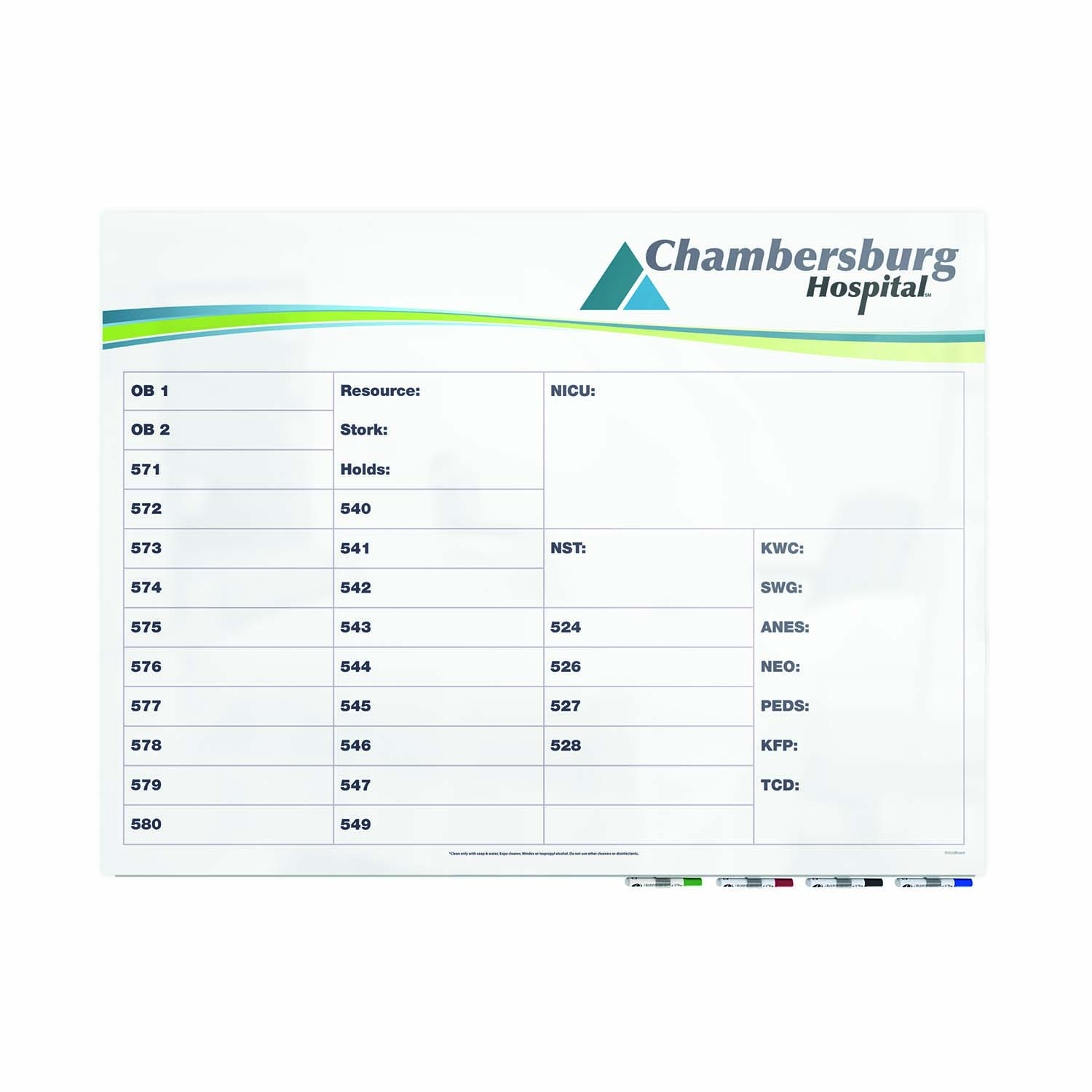 Smooth glass surface resists ghosting and staining, making the board easy to clean with most hospital cleaners.
